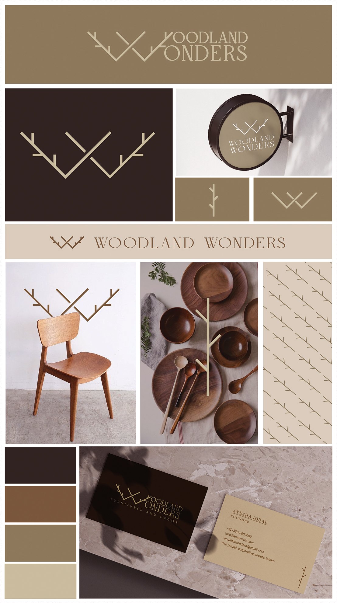 Woodland Wonders' brand identity exudes a harmonious blend of nature and elegance, encapsulated in a minimalistic yet captivating design. The color palette, dominated by earthy browns, evokes a sense of warmth, comfort, and timeless sophistication, reminiscent of the serene beauty of natural woodlands. The minimalist logo, featuring clean lines and subtle, wood stem shapes, reinforces the brand’s commitment to simplicity and quality craftsmanship. This cohesive identity reflects Woodland Wonders' dedication to creating beautifully crafted furniture and resonates with customers seeking tranquility and refined aesthetics in their living spaces.